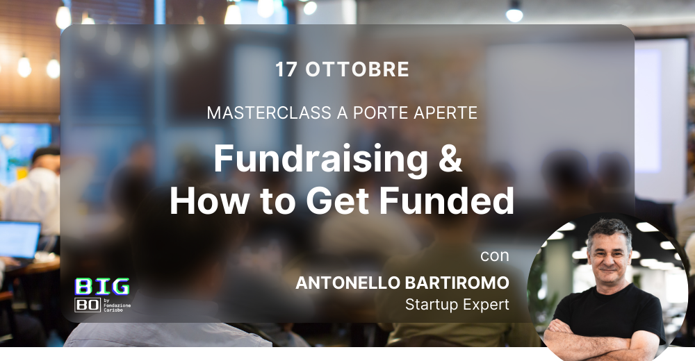 Giovedì 17 ottobre dalle ore 14.30 presso BIGBO – Boost Innovation Garage (Via della Ferriera 4, Bologna) Antonello Bartiromo, Startup Expert, condurrà l’ottava masterclass a porte aperte sul tema Fundraising & How to Get Funded.